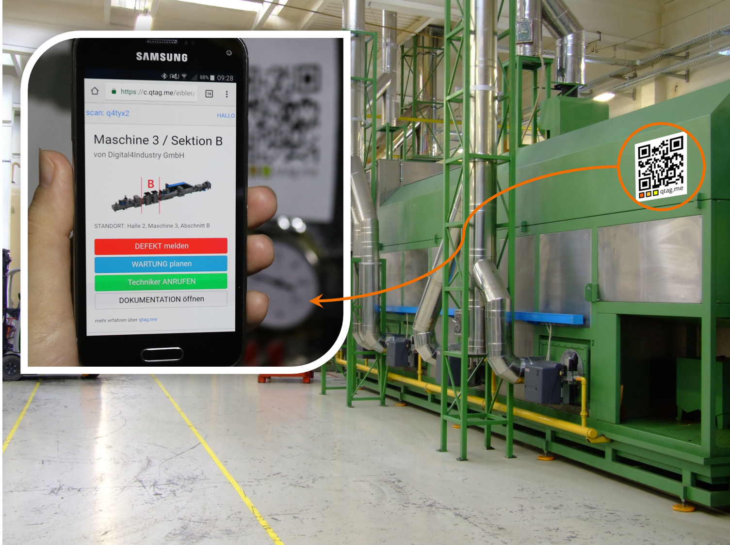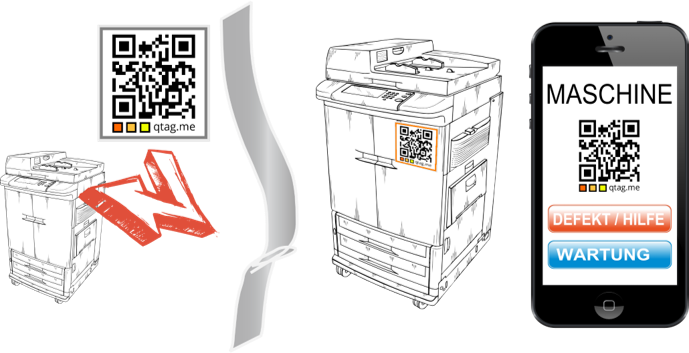 Kleben Sie einen qtag.me QR-Code auf Ihre Maschine und schon ist Ihr Kunde auf Knopfdruck mit Ihnen verbunden.